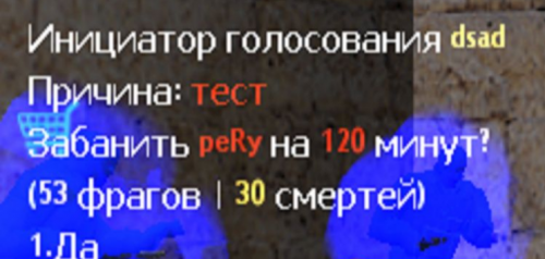 Опубліковано 9 вересня9 верес Адміністратор Voteban За допомогою цього чудового плагіна Ви зможете проголосувати за бан будь-якого гравця. Щоб проголосувати за бан гравця, введіть у чат команду /voteban. Варто зазначити, що плагін було зроблено повністю російською мовою. Качайте, тестуйте та насолоджуйтесь грою.Команди:/ voteban - Відкрити меню зі створенням голосування за бан.Автор плагіна: Slimshady.Інструкція з встановлення:1. Завантажити архів з нашого сайту та розпакувати на зручне місце на вашому комп'ютері;2. Скопіюйте плагін voteban_by_slimshady.amxx у папку на сервері /addons/amxmodx/plugins/. 3. Файл voteban_by_slimshady.sma кидаємо в папку /addons/amxmodx/scripting/.4. Перемістіть файл voteban.cfg до папки на сервері /addons/amxmodx/configs/.5. Прописуємо плагін у файлі /addons/amxmodx/configs/plugins.ini(додаємо рядок voteban_by_slimshady.amxx ). 6. Перезапускаємо сервер або змінюємо карту. Інформація Додав Ciko Додано 09.09.25 Категорія Плагіна Перегляд файла