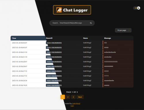 Опубліковано 7 вересня7 верес Адміністратор Chat-Logger-GoldKingZ Встановлення плагінаЗавантажте найновіший Chat-Logger-GoldKingZ.x.x.x.zipрелізВитягніть вміст у свій csgoкаталогНалаштуйте параметри вChat-Logger-GoldKingZ/config/config.jsonПерезавантажте серверНалаштування веб-інтерфейсуЗавантажте найновіший webserver.x.x.x.zipрелізРозпакувати до каталогу вашого веб-сервераНалаштуйте підключення MySQL уdatabase.php⚙️ КонфігураціяПриміткаРозташовано в ..\Chat-Logger-GoldKingZ\config\config.jsonЛокальне налаштування (натисніть, щоб розгорнути 🔽)НерухомістьОписЦінностіОбов'язковоLocally_EnableЗберегти повідомлення чату локально0-Вимкнути1-Реєструвати в чаті гравця2-Реєструвати та надсилати в кінці раунду3-Реєструвати та надсилати в кінці карти-Locally_LogMessagesOnlyТільки повідомлення журналу1-Як публічний, так і командний чат2-Тільки публічний чат3-Тільки командний чатLocally_Enable=1/2/3Locally_IncludeTheseFlagsMessagesOnlyЗаписувати лише ці прапорціПриклад: Flags : @css/admins,@css/admin""= УсіLocally_Enable=1/2/3Locally_ExcludeFlagsMessagesНе реєструйте ці прапориПриклад: Groups : #css/exclude""= Не виключати нічогоLocally_Enable=1/2/3Locally_ExcludeMessagesStartWithВиключити повідомлення, що починаються зПриклад: !./""= ВимкнутиLocally_Enable=1/2/3Locally_ExcludeMessagesContainsLessThanXLettersВиключити короткі повідомленняМінімальна кількість літер0= ВимкнутиLocally_Enable=1/2/3Locally_ExcludeMessagesDuplicateВиключити дублікати повідомленьtrue/falseLocally_Enable=1/2/3Locally_MessageFormatФормат повідомленняШаблон із заповнювачами""= ВимкнутиLocally_Enable=1/2/3Locally_DateFormatФормат датиПриклади:MM-dd-yyyyLocally_Enable=1/2/3Locally_TimeFormatФормат часуПриклади:HH:mm:ssLocally_Enable=1/2/3Locally_AutoDeleteLogsMoreThanXdaysOldАвтоматичне видалення старих журналівДні для зберігання0= ВимкнутиLocally_Enable=1/2/3Налаштування Discord (Натисніть, щоб розгорнути 🔽)НерухомістьОписЦінностіОбов'язковоDiscord_WebHookURL-адреса вебхука DiscordПриклад: https://discord.com/api/webhooks/...""= Вимкнути-Discord_StyleСтиль зовнішнього вигляду повідомлення0-Вимкнути1-Тільки текст2-Текст+Ім'я+Посилання3-+Зображення профілю4-+Окрема дата/час5-+Нижній колонтитул IP-адреси сервераDiscord_WebHookDiscord_SideColorКолір бічної сторони повідомленняШістнадцятковий код кольору (наприклад 00FFFF)Discord_Style=2/3/4/5Discord_FooterImageURL-адреса зображення нижнього колонтитулаURL-адреса зображенняDiscord_Style=3/4/5Discord_UsersWithNoAvatarImageЗображення аватара за замовчуваннямURL-адреса зображенняDiscord_Style=5Discord_LogMessagesOnlyТільки повідомлення журналу1-Обидва чати2-Тільки для всіх3-Тільки для командиDiscord_WebHookDiscord_IncludeTheseFlagsMessagesOnlyЗаписувати лише ці прапорціПриклад: SteamIDs : 76561198206086993,76561198974936845""= УсіDiscord_WebHookDiscord_ExcludeFlagsMessagesНе реєструйте ці прапориПриклад: Flags : @css/exclude""= Не виключати нічогоDiscord_WebHookDiscord_ExcludeMessagesStartWithВиключити повідомлення, що починаються зПриклад: !./""= ВимкнутиDiscord_WebHookDiscord_ExcludeMessagesContainsLessThanXLettersВиключити короткі повідомленняМінімальна кількість літер0= ВимкнутиDiscord_WebHookDiscord_ExcludeMessagesDuplicateВиключити дублікатиtrue/falseDiscord_WebHookDiscord_MessageFormatФормат повідомленняШаблон із заповнювачамиDiscord_WebHookDiscord_DateFormatФормат датиПриклади:MM-dd-yyyyDiscord_WebHookDiscord_TimeFormatФормат часуПриклади:HH:mm:ssDiscord_WebHookКонфігурація MySQL (натисніть, щоб розгорнути 🔽)НерухомістьОписЦінностіОбов'язковоMySql_EnableЗберегти в MySQL0-Вимкнути1-Негайно записувати в журнал2-Записувати в кінці раунду3-Записувати в кінці карти-MySql_HostХост MySQLПриклад:123.45.67.89MySql_Enable=1/2/3MySql_DatabaseІм'я бази данихПриклад:Chat_LogsMySql_Enable=1/2/3MySql_UsernameІм'я користувача бази данихПриклад:rootMySql_Enable=1/2/3MySql_PasswordПароль бази данихПриклад:Password123123MySql_Enable=1/2/3MySql_PortПорт бази данихЗа замовчуванням:3306MySql_Enable=1/2/3MySql_LogMessagesOnlyТільки повідомлення журналу1-Обидва
