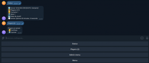 Опубліковано 7 вересня7 верес Адміністратор Cs2Telegram ВимогиCounterStrikeSharp версії 1.0.296PRTelegramBot версії 0.7.6Telegram.BotФункціональність ботаБілий списокАдміністраториПереглянути стан сервераПереглянути гравців на серверіПерегляд інформації та дій гравців *(Тільки для адміністраторів)Надіслати команду сервера *(Тільки для адміністраторів)Надіслати повідомлення сервера *(Тільки для адміністраторів)Повідомити адміністратора, якщо гравець підключився до сервера (налаштування NotifyAdminOnConnectUser у Cs2Telegram.json)Створіть власне меню з повідомленнями та веб-посиланнямиГравець може надіслати повідомлення адміністраторам сервера в Telegram.Команди бота:СтатусГравціМенюМеню адміністратора *(Тільки для адміністраторів)Команда сервера *(Тільки для адміністраторів)Генерація вбудованих команд обраного меню з конфігурації Cs2Telegram.json - ServerCommandsMenuItemsПовідомлення сервера *(Тільки для адміністраторів)Інформація про гравців *(Тільки для адміністраторів)Дії з гравцямиКоманди на сервері!tgreport [повідомлення] - Надіслати повідомлення адміністраторам сервера в Telegram.Конфігураціяшлях - ..\csgo\addons\counterstrikesharp\configs\plugins\Cs2Telegram\Cs2Telegram.json{ "Token": "", - Key for interacting with the bot. "Admins": [], - List of administrators. "WhiteListUsers": [], - List of users who can use the bot. If the value is empty, all users can use the bot. "ClearUpdatesOnStart": true, - Clears commands that were invoked when the bot was not running. "BotId": 0, - Unique identifier of the bot. May be required if multiple bots are used in the same application. "ServerCommandsMenuItems": ["bot_add", "bot_kick"], - List command for inline buttons "NotifyAdminOnConnectUser": true, - If true notify admins on connect new player on server "ColumnMainMenu": 2, - Count column in main menu "CustomCommandsEnabled": true, - enable or no custom commands "ShowCustomMenu": false, - If true show custom menu "CustomCommands": { - "Commands": [ { "ButtonName": "Custom Menu", "Message": "Custom Message", "AddInMainMenu": true, "Column": 1, "WebMenuItems": [ { "Name": "Google", "Url": "Https://google.com" } ] } ] }, "ConfigVersion": 4 } Інформація Додав Ciko Додано 07.09.25 Категорія Плагіна Перегляд файла